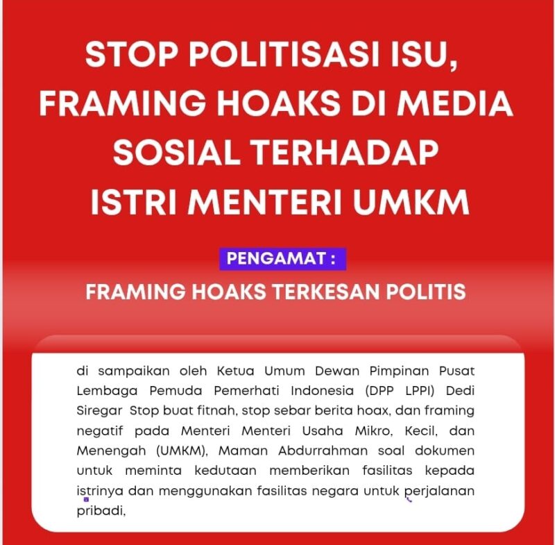 di sampaikan oleh Ketua Umum Dewan Pimpinan Pusat Lembaga Pemuda Pemerhati Indonesia (DPP LPPI) Dedi Siregar Stop buat fitnah, stop sebar berita hoax, dan framing negatif pada Menteri Menteri Usaha Mikro, Kecil, dan Menengah (UMKM), Maman Abdurrahman soal dokumen untuk meminta kedutaan memberikan fasilitas kepada istrinya dan menggunakan fasilitas negara untuk perjalanan pribadi,