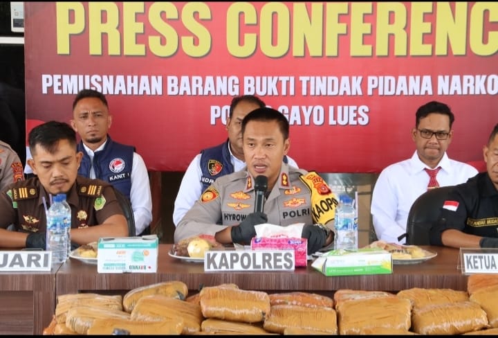 “Pada kesempatan yang berbahagia ini, Polres Gayo Lues melaksanakan pemusnahan barang bukti narkotika jenis ganja yang telah memperoleh penetapan status barang bukti dari Kejaksaan Negeri Gayo Lues serta penetapan penyitaan dari Pengadilan Negeri Blangkejeren,” ujar AKBP Hyrowo.